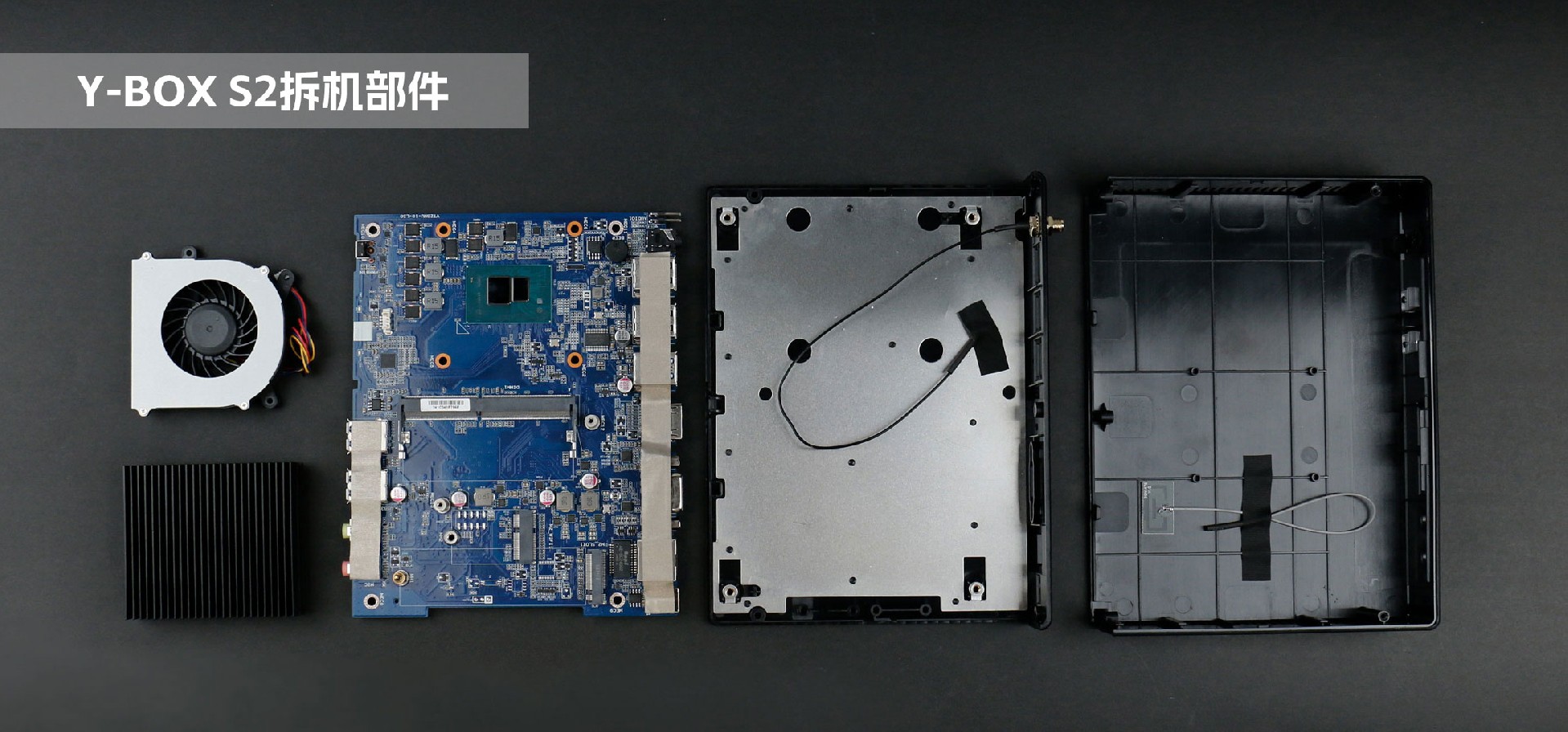 杰和桌面云終端Y-BOX S2機殼由兩片式塑膠殼組合而成,整機由上至下主要分為三個部分:頂部外殼、內部主板、底部外殼。底部外殼內附一層鋁板防靜電,以防主板被靜電損壞。主板處理器頂部安裝一體式鋁板鰭片,并涂抹一層散熱膏用于導熱,提高散熱強度。同時,主板中部安裝強勁的風扇用于散熱,降低內存與硬盤讀取時受溫度的影響,提高運行穩定性。