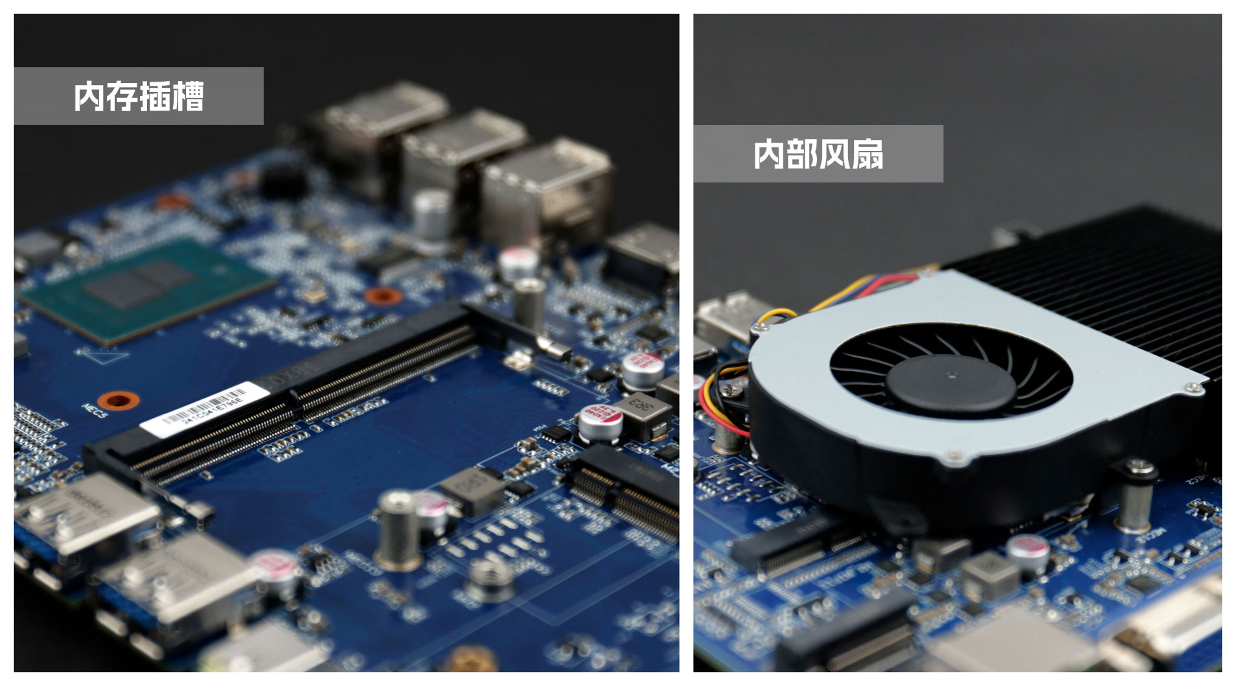 杰和桌面云終端Y-BOX S2主板中部是內存插槽,采用單通道筆記本內存槽設計,最大支持容量可達32GB,最高支持DDR4-3200MHz頻率,橫插的形式可以減少主板的占用體積,使整體機身更緊湊,內存頂部的風扇起到高效散熱的作用。