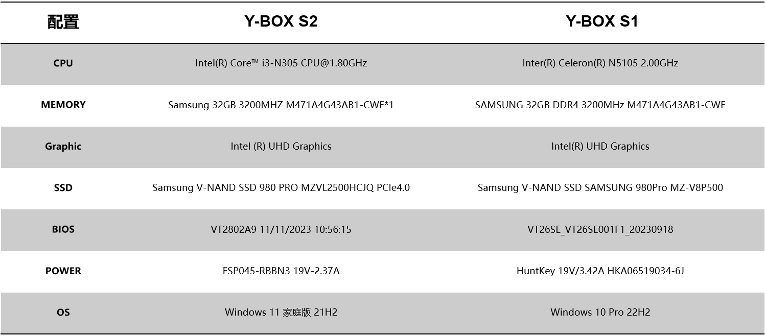 針對桌面云終端Y-BOX S2的測試項目中,最值得關注的是性能測試的跑分數據和穩定性測試內容,這能直觀影響主機在使用過程中的穩定性和用戶的使用體驗。針對性能測試,我們選擇了將Y-BOX S2與前一款更迭產品Y-BOX S1進行對比分析,Y-BOX S2支持Intel® Alder lake-N處理器,Y-BOX S1支持Intel® Jasper Lake,并分別選取了以下配置: