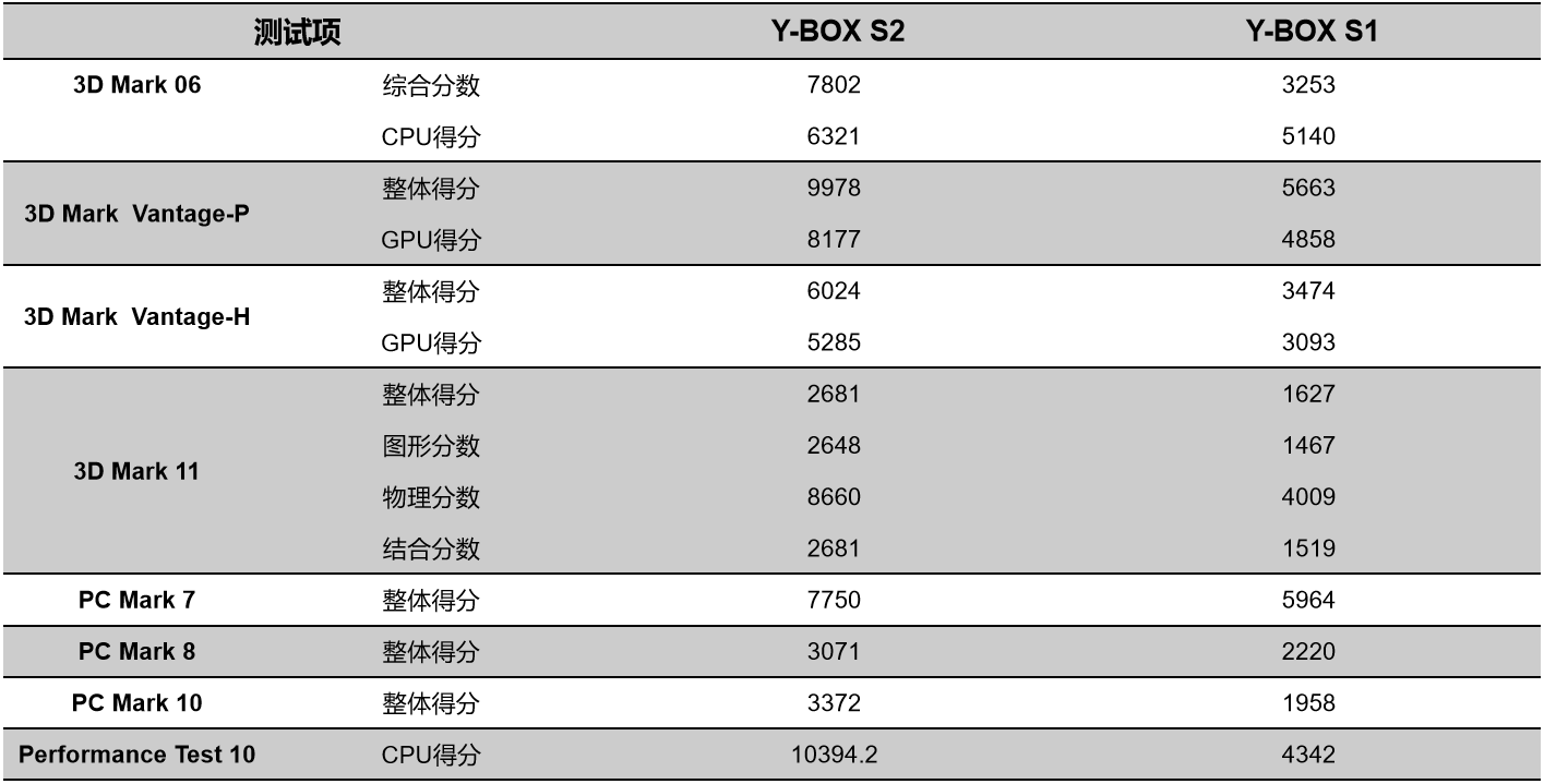 我們來具體看看各個測試項目的跑分情況,測試項目包括顯示性能測試、系統性能測試、CPU性能測試,分別用3D Mark、PC Mark以及Performance 10等系列不同軟件的跑分數據,針對兩款主板的跑分情況可以看出,杰和桌面云終端Y-BOX S2的數據在各項性能上都得到了大幅度提升,柱狀圖能更直觀地體現出數據的變化,我們將針對具體的幾項數據來進行詳細分析。