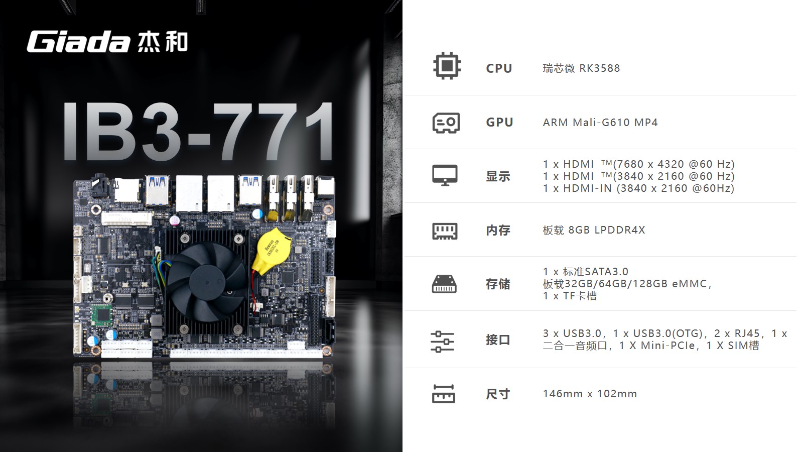 杰和工業級ARM主板IB3-771采用瑞芯微RK3588處理器,內置G610 MP4 GPU,擁有6 TOPS算力的NPU,支持8K視頻硬件解碼編碼及多攝像頭輸入,支持eDP/DP/ HDMI2.1/MIPI 多種顯示接口。
