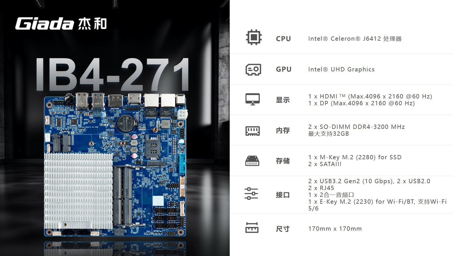 杰和IB4-271搭載的是Intel® Celeron® J6412處理器,Elkhart Lake平臺在單線程性能上提升了1.7倍,在多線程性能方面提升了1.5倍,具有三個顯示輸出,包括DP、HDMI 和 LVDS 端口,能夠為工業的多媒體應用、標牌顯示和數字菜單提供足夠的靈活性。