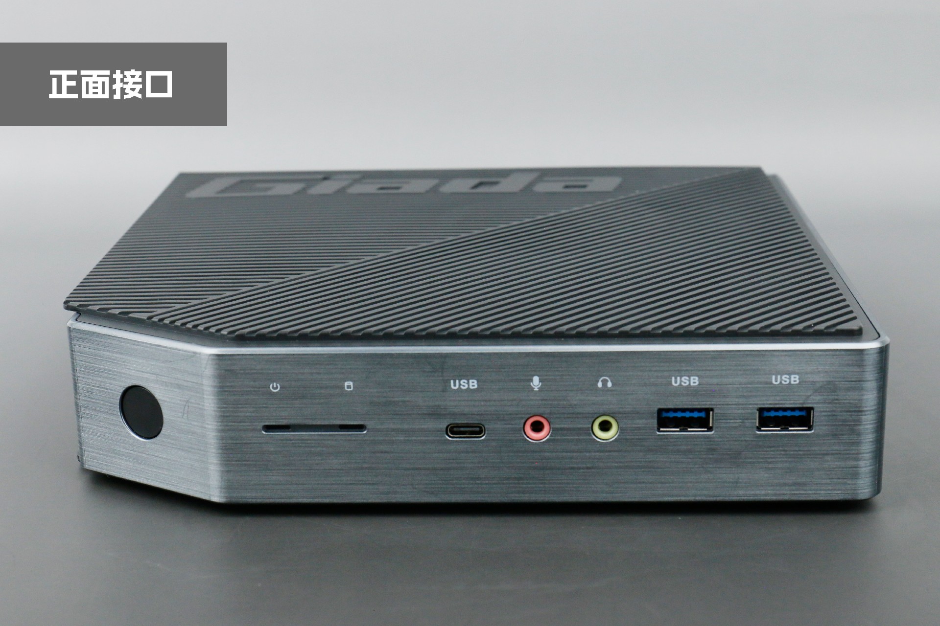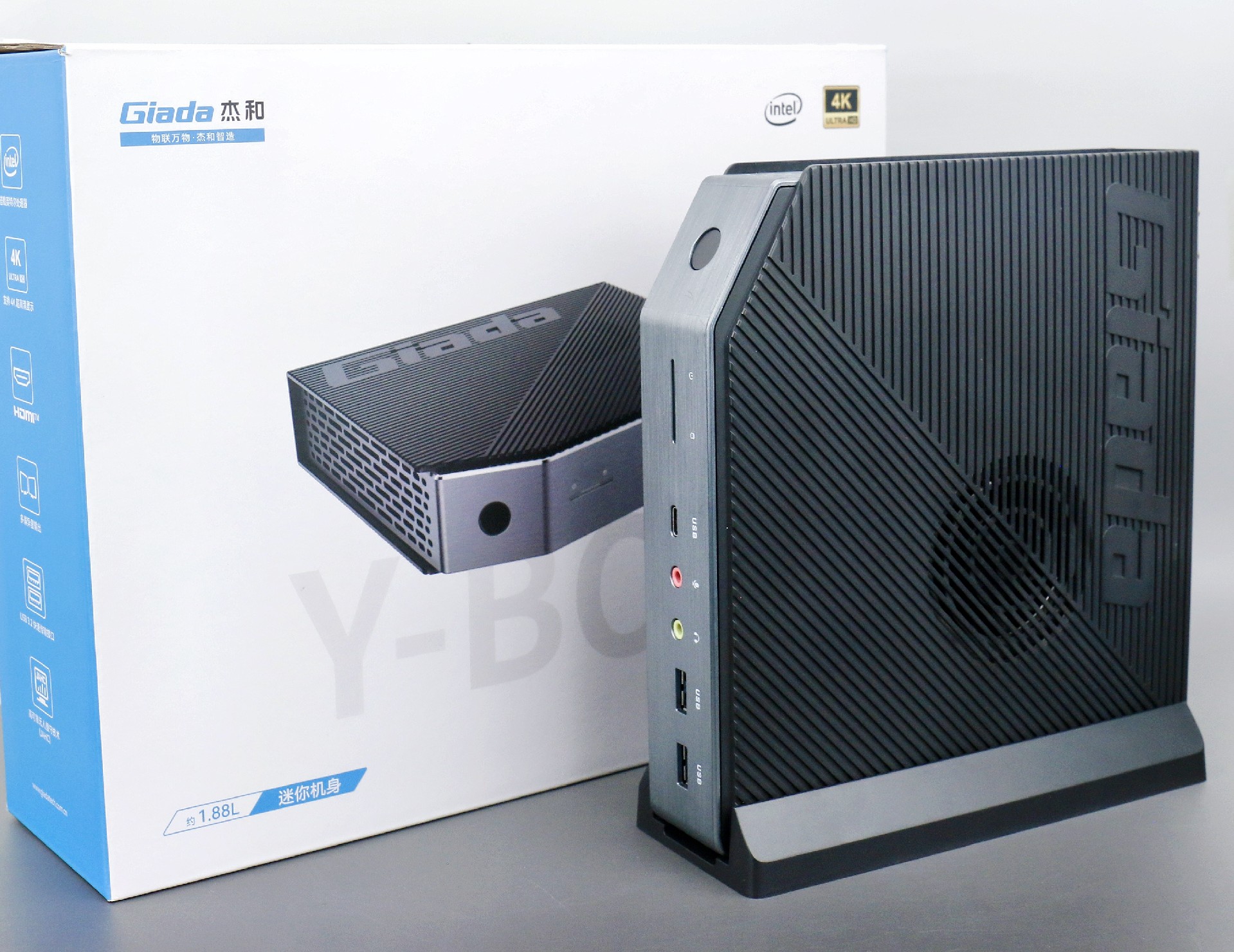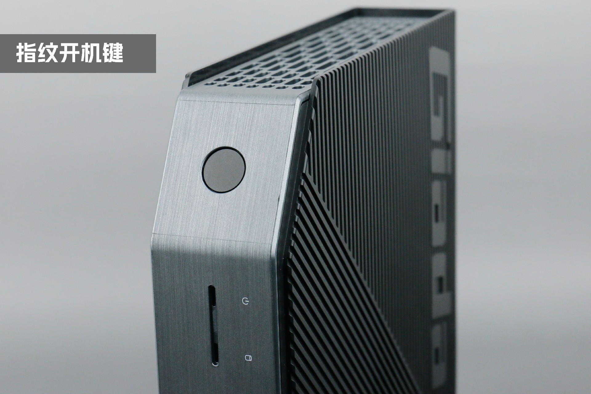 打開杰和桌面云終端Y-BOX P3,你會發現它的結構并不是常見的四方體設計,而是在轉角處好似被切割開一個角,切割出來的面積為指紋識別開機鍵。它的外觀為優雅的銀灰配色,機身正面厚重感十足,頂部依然沿用黑色啞光柵格并延伸至整機背面,磨砂塑膠材質殼,印刻杰和Giada品牌名;其他三面則為銀灰色,兩側是蜂窩式通風口設計。
