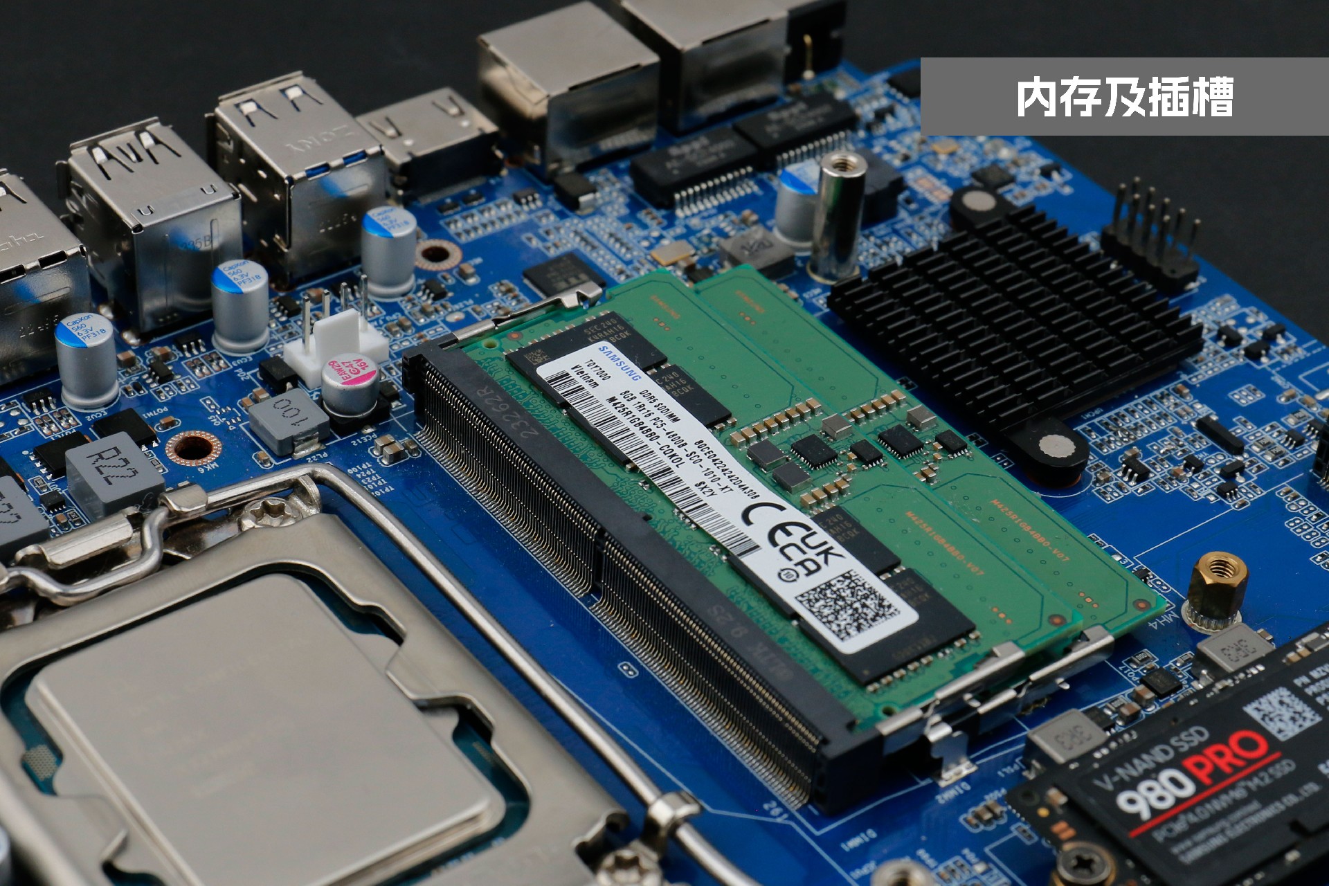 杰和桌面云終端Y-BOX P3主板中部是內存插槽,采用雙通道筆記本內存槽設計,最大支持容量可達64GB,最高支持DDR5-5600MHz頻率,比 DDR4 至高標準數據速度 3200MT/S多傳輸 1.75 倍,橫插的形式可以減少主板的占用體積,使整體機身更緊湊,內存頂部的風扇起到高效散熱的作用。