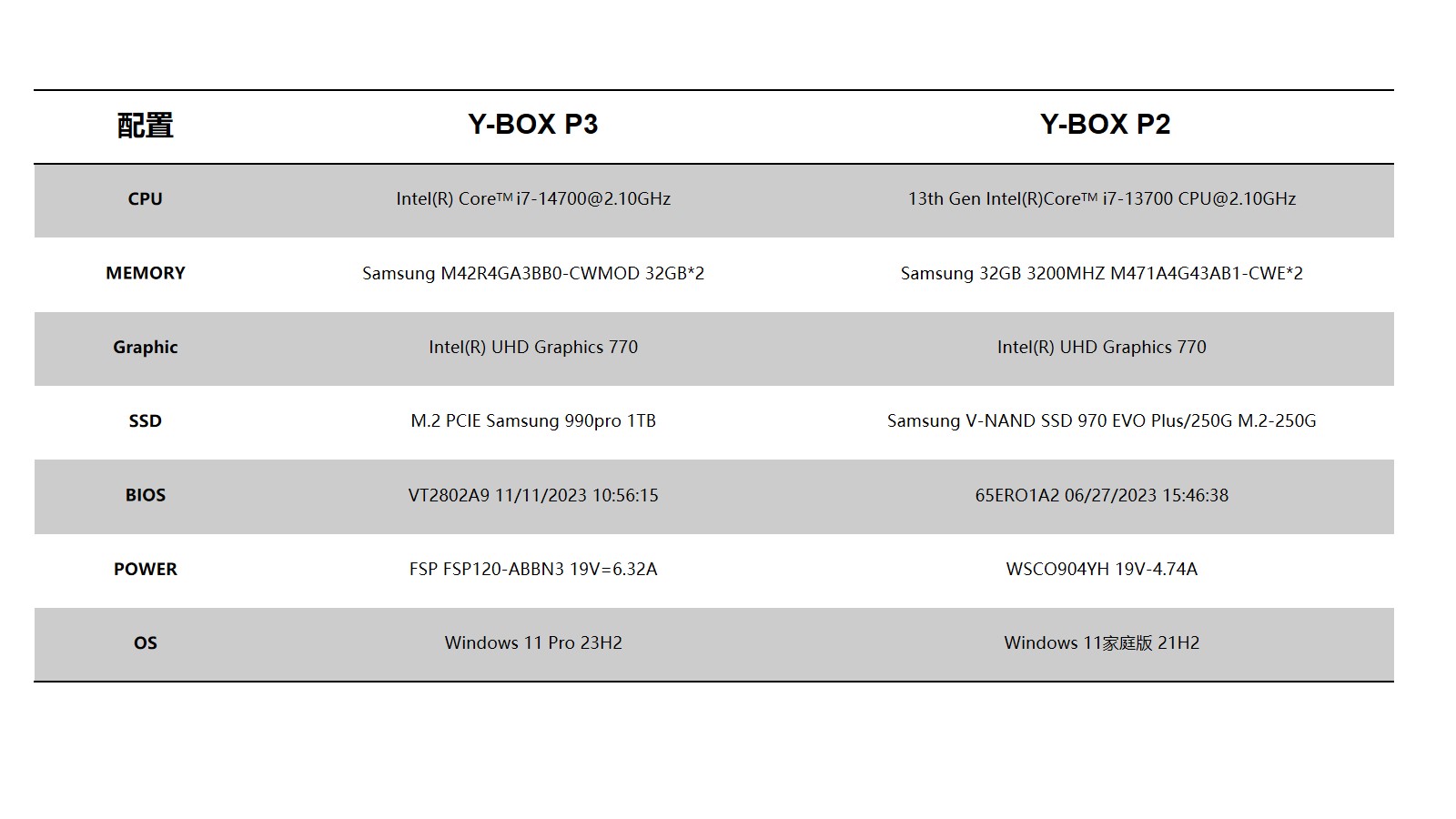 作為Y-BOX P2的迭代產品,我們選取了以下配置,將Y-BOX P3與Y-BOX P2進行對比分析,結論先行:兩款產品跑分數據表示,Y-BOX P3的跑分數據及穩定性能明顯領先Y-BOX P2。
