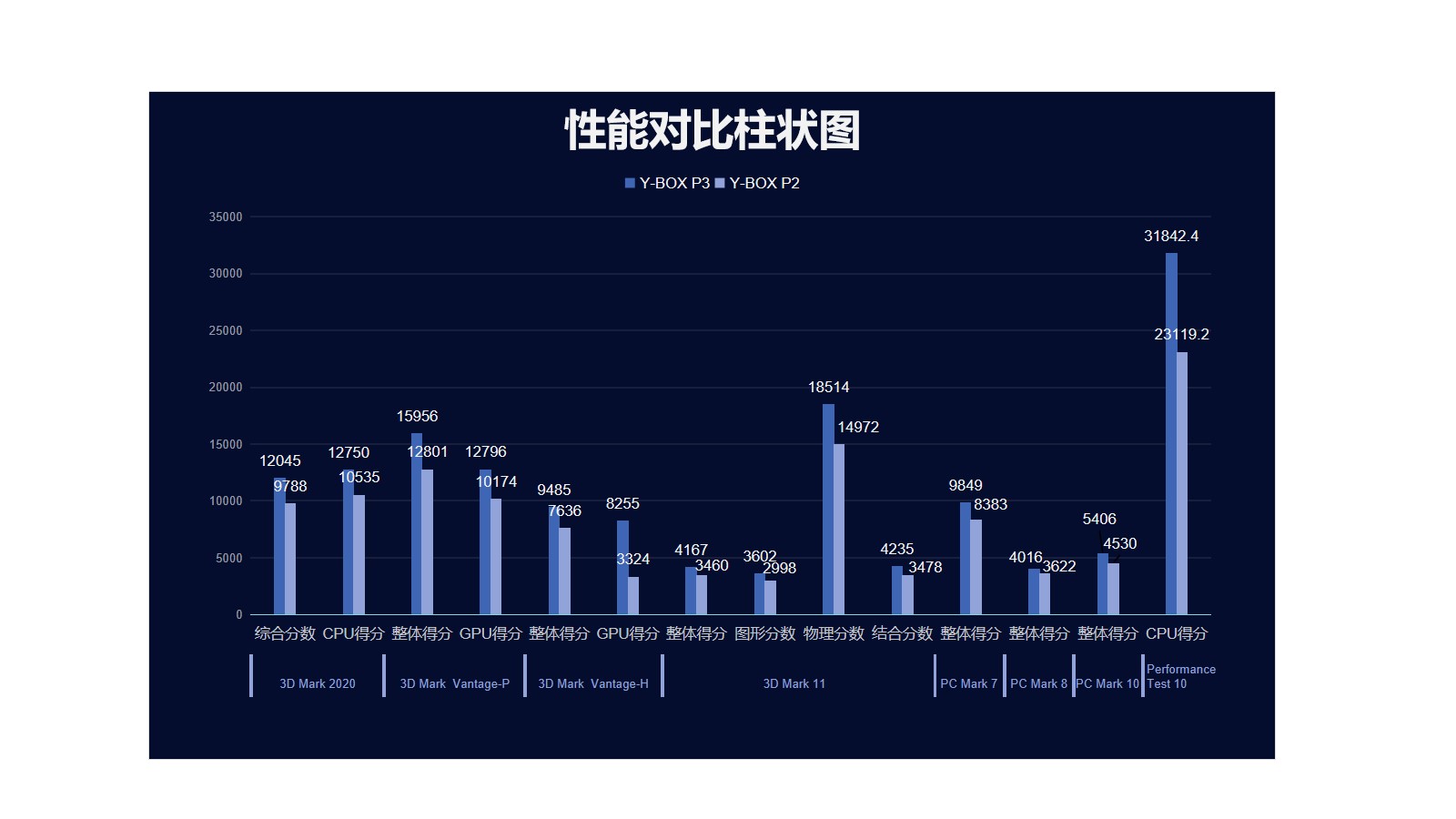 我們來具體看看各個測試項目的跑分情況,我們分別用3D Mark、PC Mark以及Performance 10等不同系列不同軟件進行跑分,測試項目涵蓋顯示性能測試、系統性能測試、CPU性能測試等。通過下面的表格及柱狀圖可以看出,杰和桌面云終端Y-BOX P3的數據在各項性能上都得到了大幅度提升。