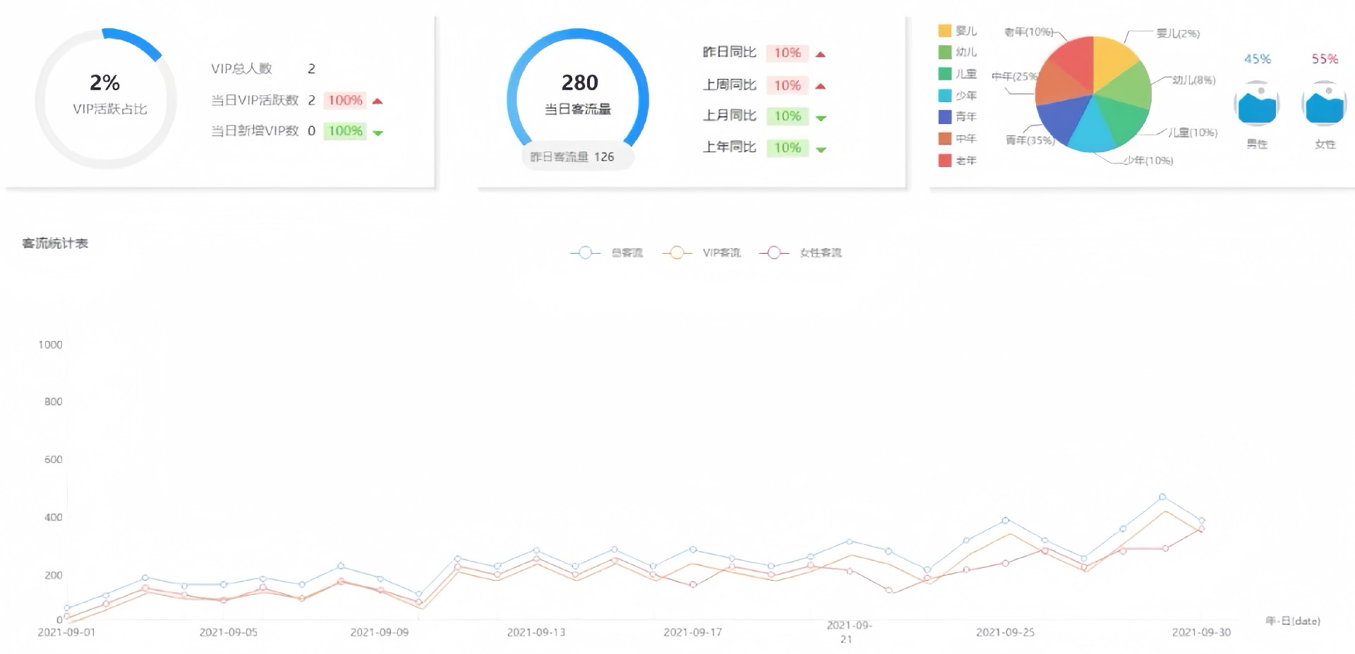 后臺還可統計總客流量、不同類型客流占比數、不同周期內客流量變化比例、數據報表導出等,并以餅狀圖和曲線圖直觀體現客流量變化情況。幫助商鋪實現對客戶信息系統化管理,掌握客流變化情況,調整優化運營策略的目標