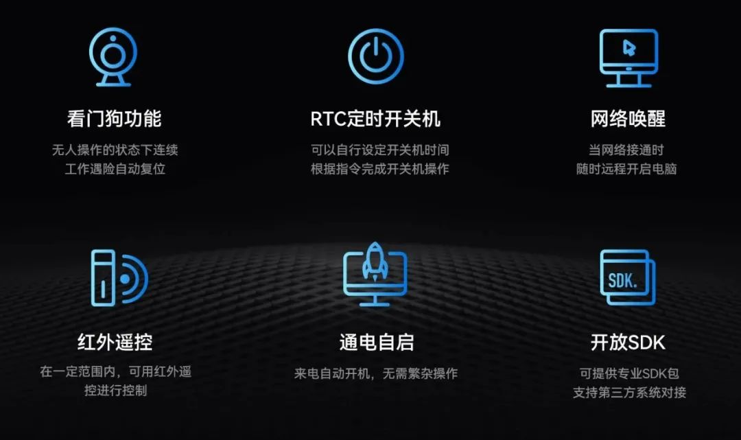 通過定時開關機、看門狗計時器、RTC宕機自檢、紅外遙控和局域網喚醒等功能,實現設備綠色運行。