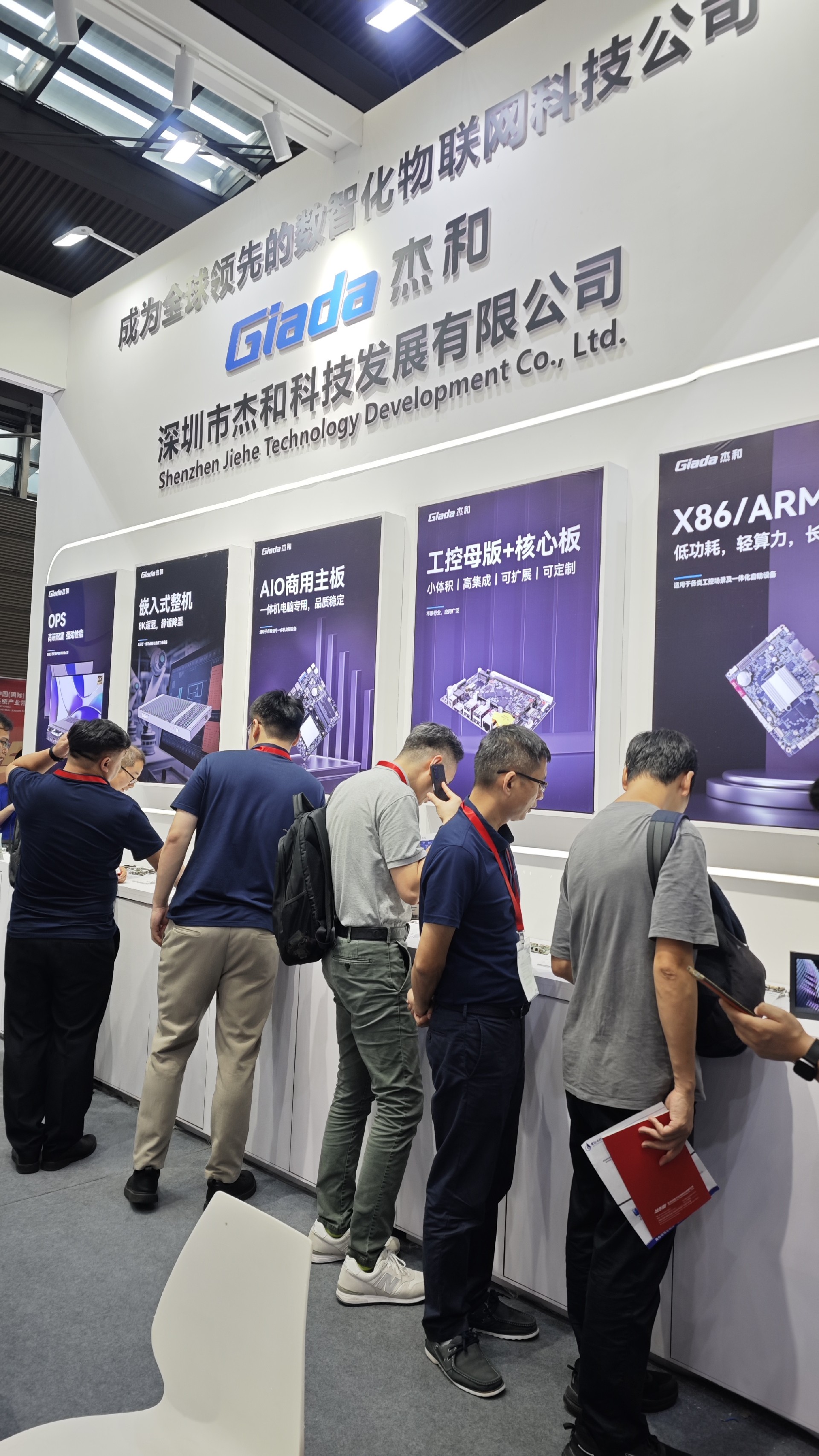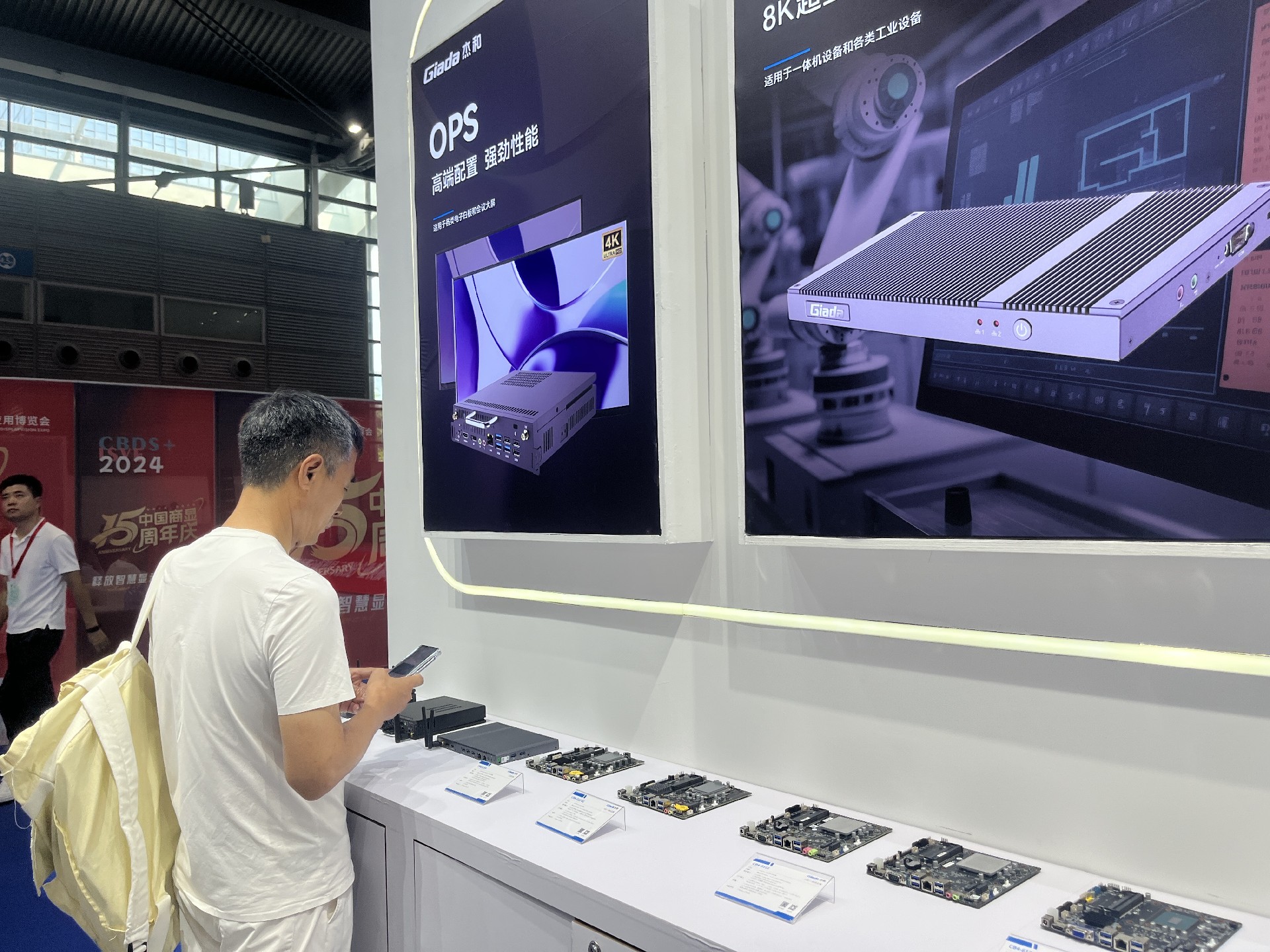 杰和科技展位放置在c位的明星產品和最新產品吸引了眾多參觀者的目光。展臺下方整齊排列著公司的產品,包括主板、嵌入式整機、OPS等,這些產品不僅適用于商業展示領域,還廣泛應用于工業、制造業和教育業等多個行業。