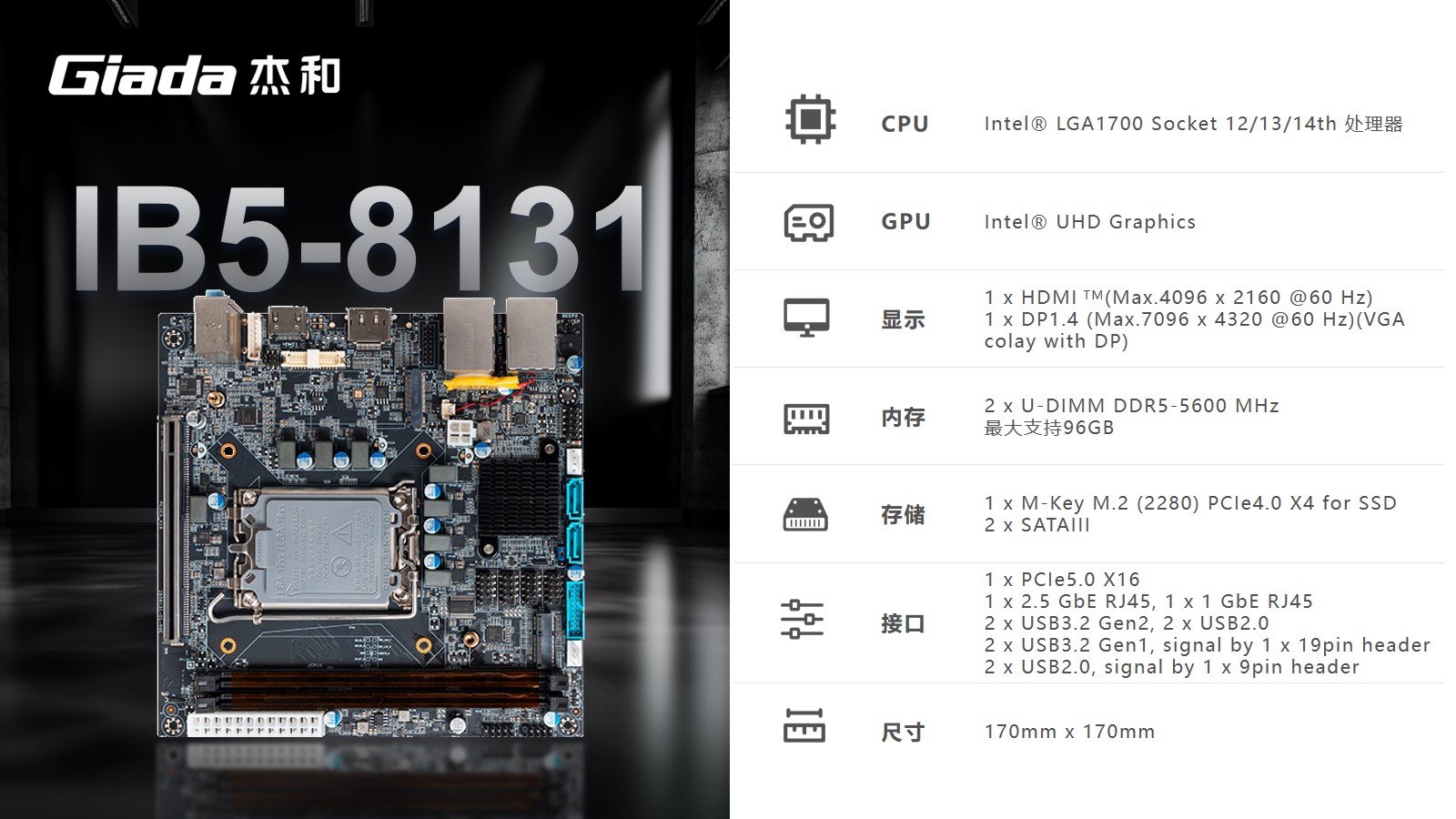 杰和科技嵌入式主板IB5-8131采用Intel® B760 芯片組,支持Intel® 第12代至14代處理器。大容量內存支持,配備2個U-DIMM DDR5 內存,最大支持96GB,頻率最高可達5600MHz,可靈活擴展NVMe SSD和2個SATA3.0存儲?;诖颂攸c,智能柜員機可滿足設備流暢絲滑運行的功能。