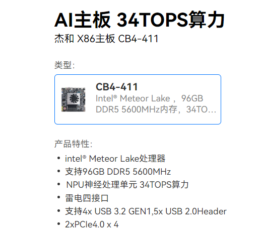 CB4-411支持英特爾Ultra5、Ultra7、Ultra9H系列處理器,支持本地AI計算,擁有34TOPS算力、DDR5高速內存、雷電4接口、2.5 GbE 以太網等功能特性。還在主板功能上進行改良,增加一鍵靜音、一鍵熄屏、一鍵音量加減的功能。