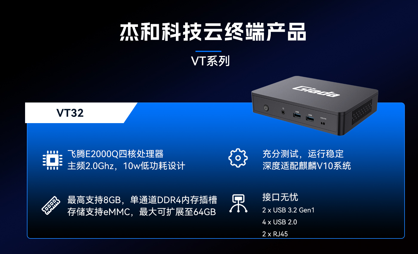近期杰和科技推出的云終端VT32,以國產飛騰E2000Q芯片作為核心處理器,深度適配國產銀河麒麟V10系統,在政務、金融等對數據安全要求極高的領域深受關注。