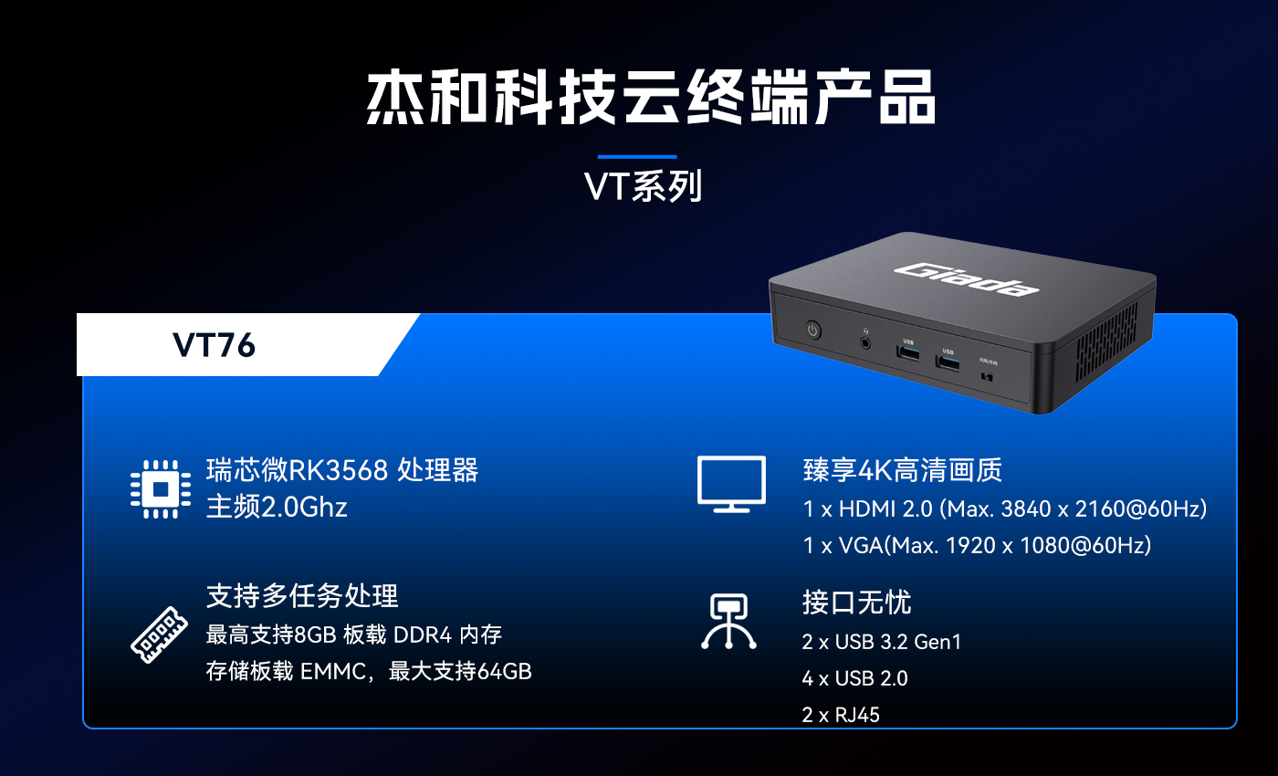 與之外形相似的云終端VT76,支持ARM架構,搭載瑞芯微RK3568處理器,適配debian系統,適用于教育、辦公、開源等應用場景,能夠滿足不同用戶對于軟件安裝和使用的多樣化需求。