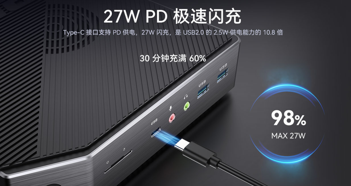 搭載Type-C接口,支持PD協議27W快充,30分鐘可充滿60%。