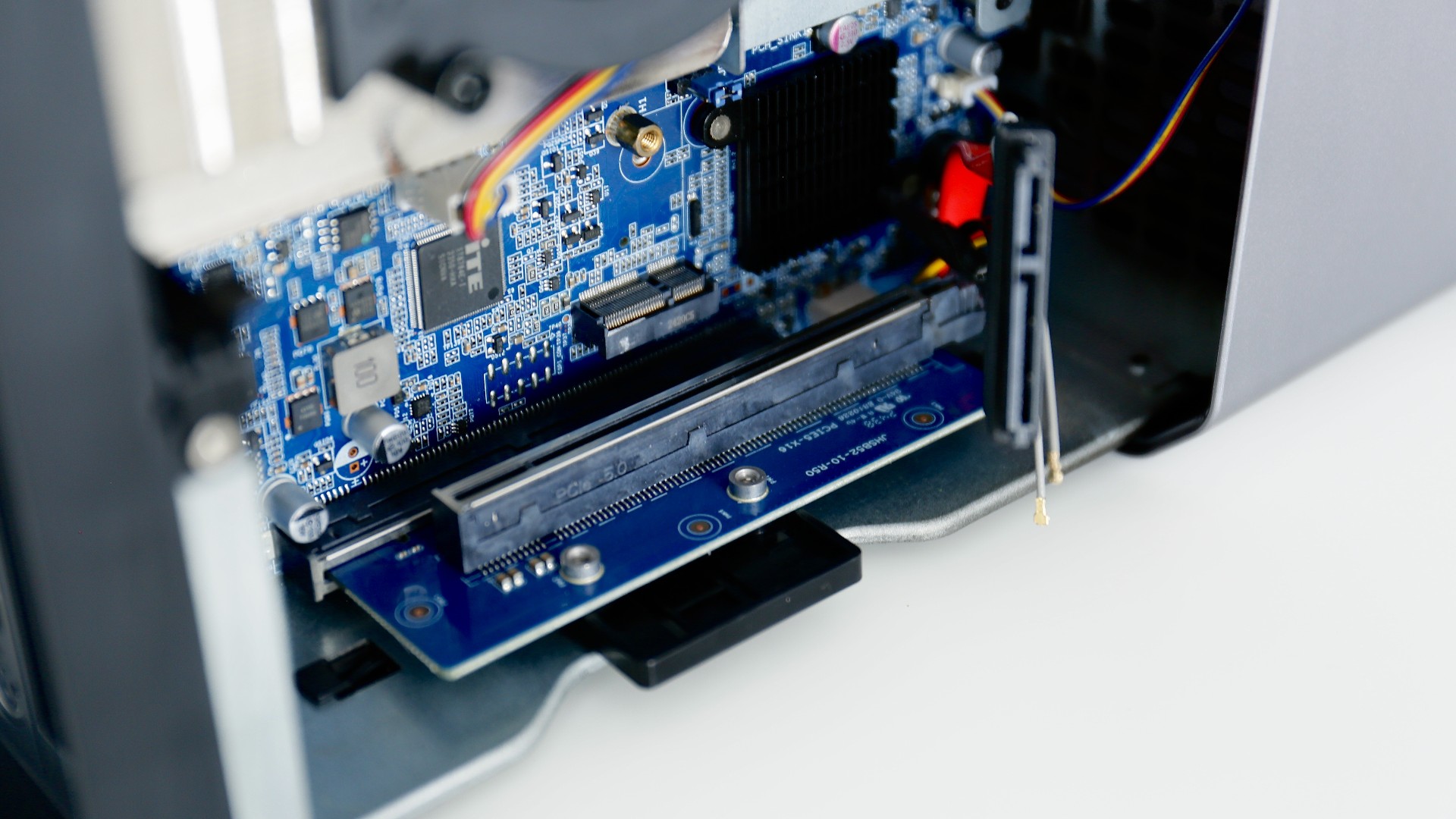 打開WA814內部,我們可以看到PCle5.0 x16 高速擴展口,它的速度高達64GB/s,可以實現獨立顯卡、多網口、高速 SSD、多 COM 等設備的擴展。