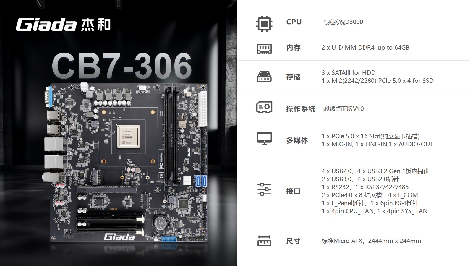 搭載飛騰騰銳D3000處理器,騰銳D3000是目前國內性能最強的 ARM 架構桌面 CPU。它的主頻達到2.5GHz,集成了 8 個飛騰自主研發的新一代 FTC862 高性能處理器內核。支持雙通道DDR4內存,支持16條PCIe 5.0總線,可外接獨立顯卡。主板尺寸為標準Micro ATX,244 x 244 mm大小,搭配系統為麒麟桌面版V10。