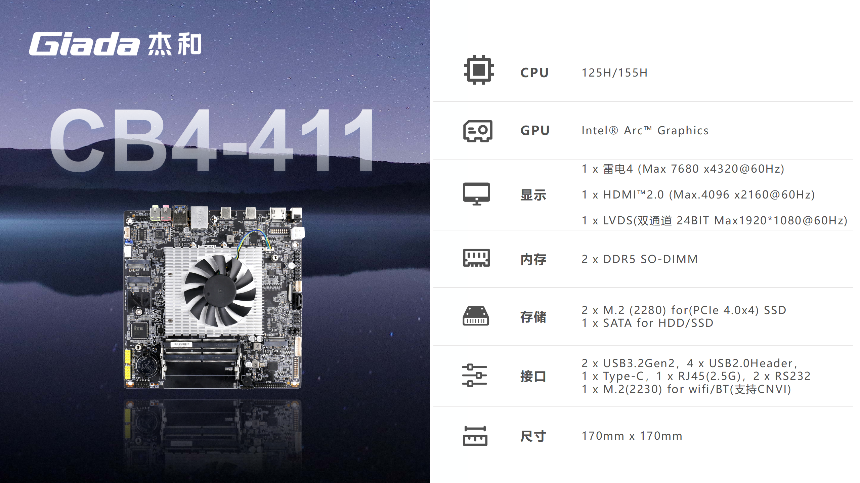 對于追求強大AI算力需求的用戶而言,杰和科技的 CB4-411 主板堪稱不二之選。這款主板可搭載Ultra5、Ultra7、Ultra9H系列處理器,這些處理器以卓越的性能和能效,為各種計算任務提供了強大的支持。它能夠讓用戶直接在電腦上高效處理AI工作,在圖像識別、圖形渲染、視頻編輯等任務中表現卓越。