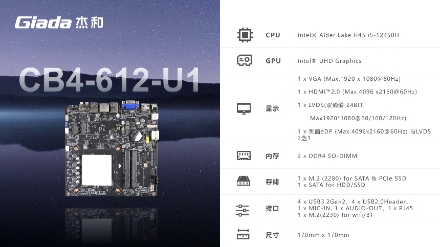 CB4-612-U1是一款高性能主板, 搭載英特爾Alder Lake平臺 i5-12450H,45W TDP功耗,專為辦公、教育、輕量級創意設計等場景而生。