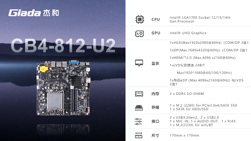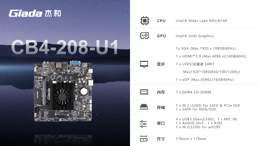杰和科技一體機主板基于X86架構設計,具有良好的兼容性與性能表現,均采用Thin mini-ITX 170mm*170mm尺寸規格設計,在緊湊機身中實現功能集成與空間優化。接下來,我們從實際需求出發,為您提供選型推薦。