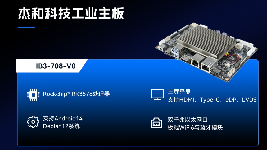 面向教育、安防、工業控制等智能化場景,杰和科技推出多平臺、多尺寸的主板解決方案,涵蓋Intel、瑞芯微 Rockchip、國產飛騰與兆芯平臺,產品覆蓋M-ATX、Mini ITX、Thin MiniITX、3.5寸、PICO等標準主板,具備豐富的擴展接口與高可靠性,支持多系統兼容及定制化服務。