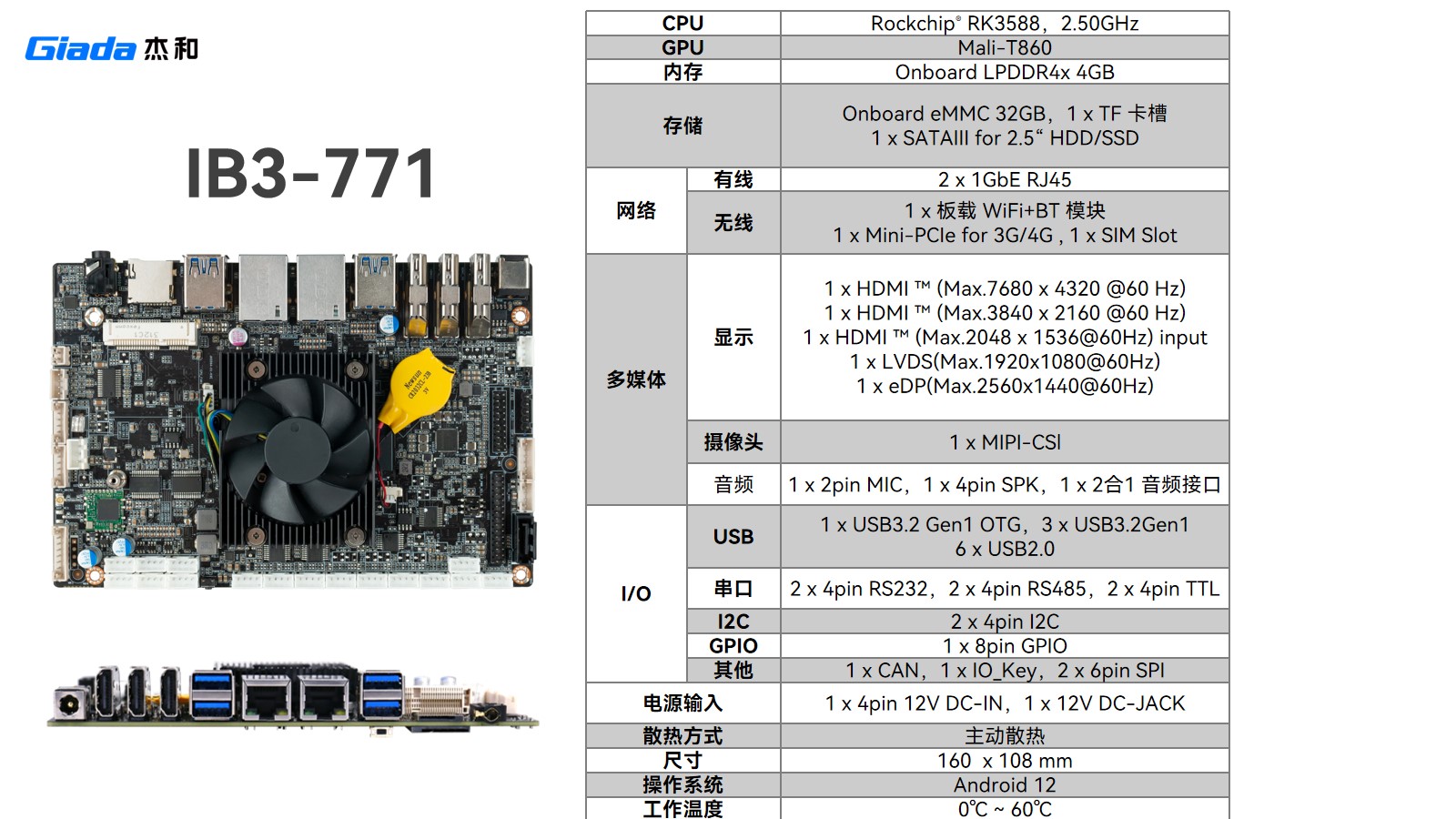 以杰和科技IB3-771、IB3-741為例,IB3-771搭載了RK3588處理器,內置高性能NPU,6TOPS算力,8K超高清顯示輸出能力,兼容安卓12系統,可為工業視覺檢測提供強勁算力與精細畫面支持。該主板支持多路MIPI-CSI攝像頭輸入,可與多種工業相機無縫對接,實現圖像采集、處理與顯示的一體化方案,快速完成物件識別篩選。