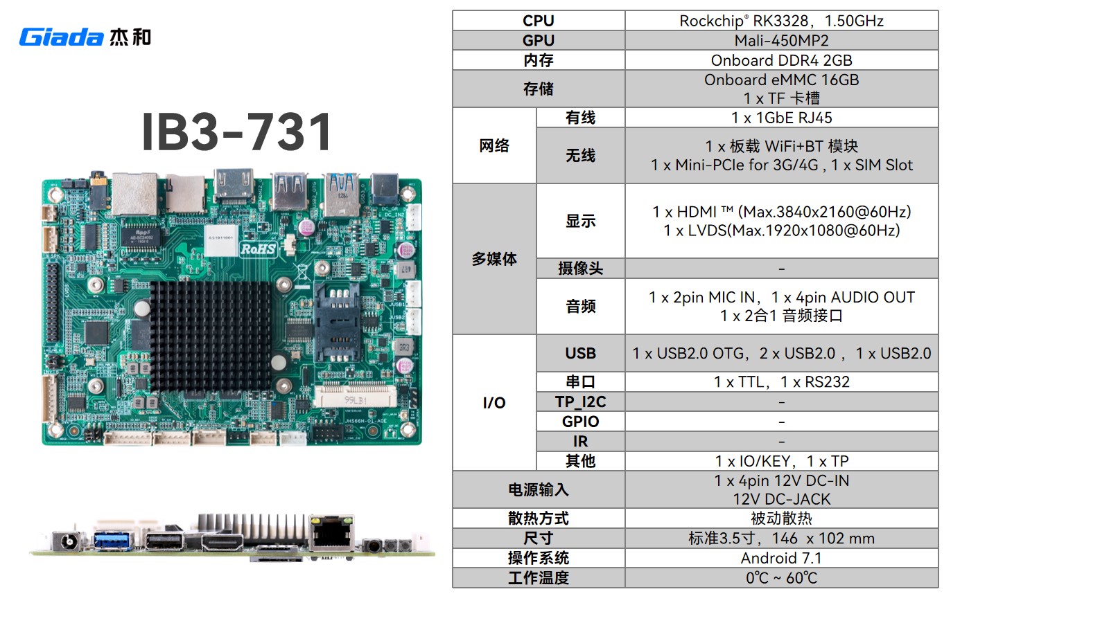 IB3-731搭載RK3328處理器,主頻1.50GHz,2GB DDR4內存+ 16GB eMMC 存儲。1GbE RJ45、板載 WiFi + BT及Mini - PCIe擴展 3G/4G,適配多網絡環境;HDMI(4K@60Hz)+ LVDS(1080P@60Hz)雙顯輸出,在便利店無人零售終端,可自行實現基礎視頻播放、交互。是預算有限、聚焦基礎展示交互項目首選 。