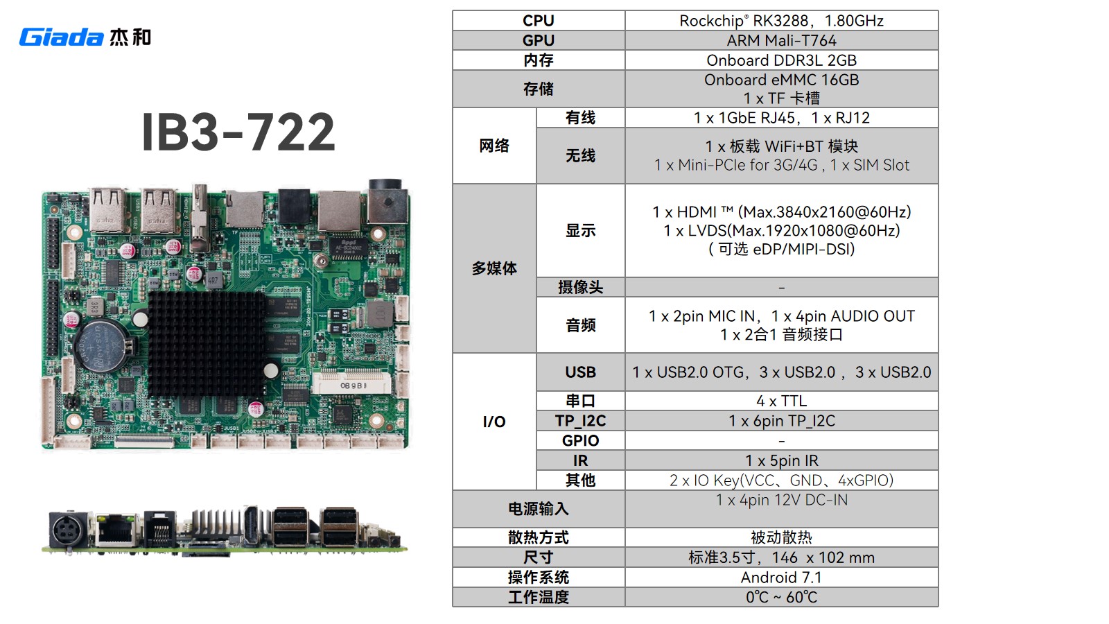 IB3-722搭載了RK3288 處理器,1.80GHz主頻,2GB DDR3L 內存 + 16GB eMMC 存儲 。1GbE RJ45 + RJ12 有線網靈活組網,7個USB 接口支持同步接入掃碼槍、指紋儀、熱敏打印機,4個TTL 串口拓展環境傳感器(溫濕度、光線 ),實現 “身份核驗→業務辦理→憑證打印→環境自適應調光” 全流程;3G/4G 擴展能力,讓終端在無線、有線網絡場景(如戶外臨時服務點 )也能聯網交互。