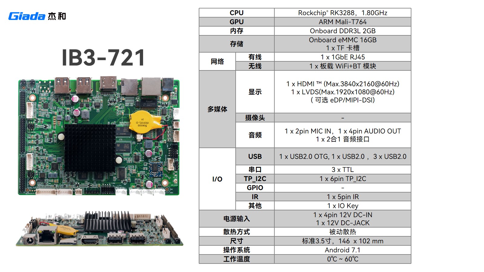 IB3-721同樣采用 RK3288 處理器,通過精簡接口進一步控制成本:保留 1GbE RJ45 網口,刪減 RJ12 ,USB 減至 5 個、TTL 串口減為 3 個 ,在滿足基礎商顯交互(如零售機、查詢機)同時,降低成本,適配功能聚焦、對成本敏感場景 。
