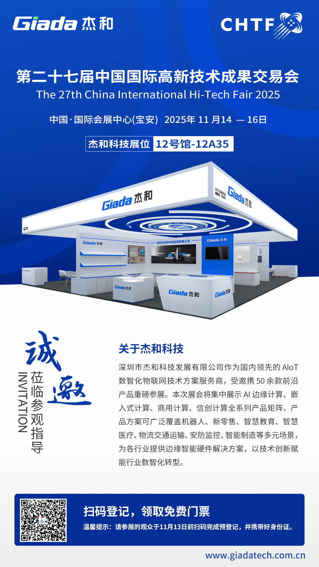 由深圳市人民政府主辦的第二十七屆中國國際高新技術成果交易會(簡稱“高交會”),將于2025年11月14日至16日在深圳國際會展中心(寶安)盛大啟幕。本屆高交會以“科技強縣展區”為核心亮點,聚焦人工智能、生物制造、新能源等前沿科技領域,助力區域產業高質量發展。杰和科技受邀參展,將在12A35號展位(人工智能與機器人產業鏈展館)呈現最新成果,誠邀您蒞臨交流,共探產業新機遇。