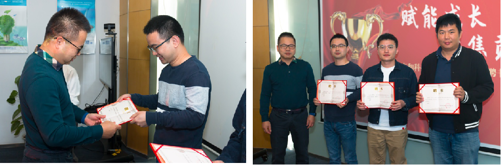 緊接著是聘書頒發環節。公司總經理林總為國際銷售中心三名新任見習高級銷售經理頒發了公司聘書。三位同事表示:“非常感謝公司給予的職業發展機會,同時也會非常珍惜公司為自己制定的專項培養計劃,全力以赴的進行相關項目的學習,爭取成功實現轉身,在工作中努力奮斗,不斷總結,帶領團隊贏得勝利!”