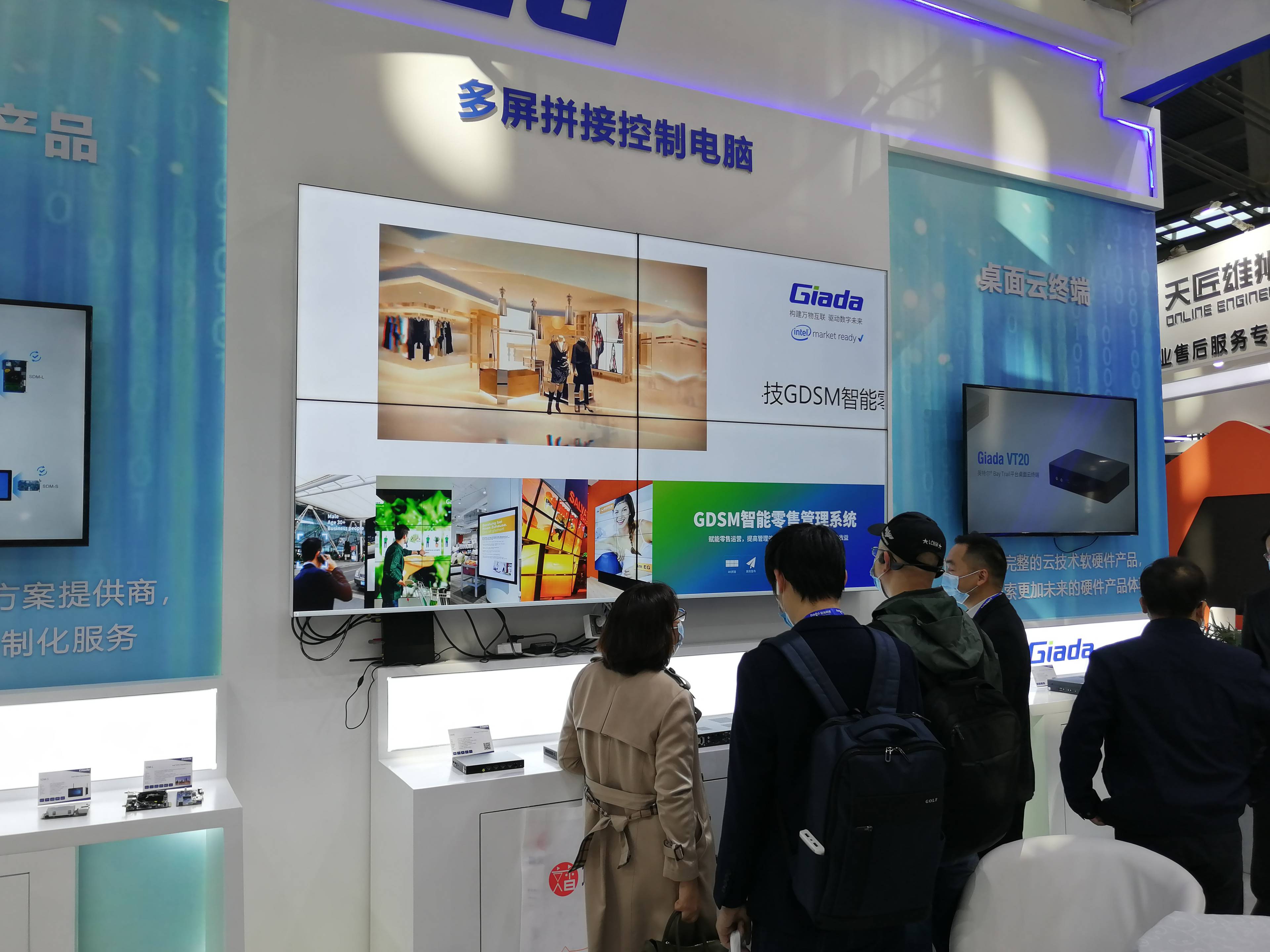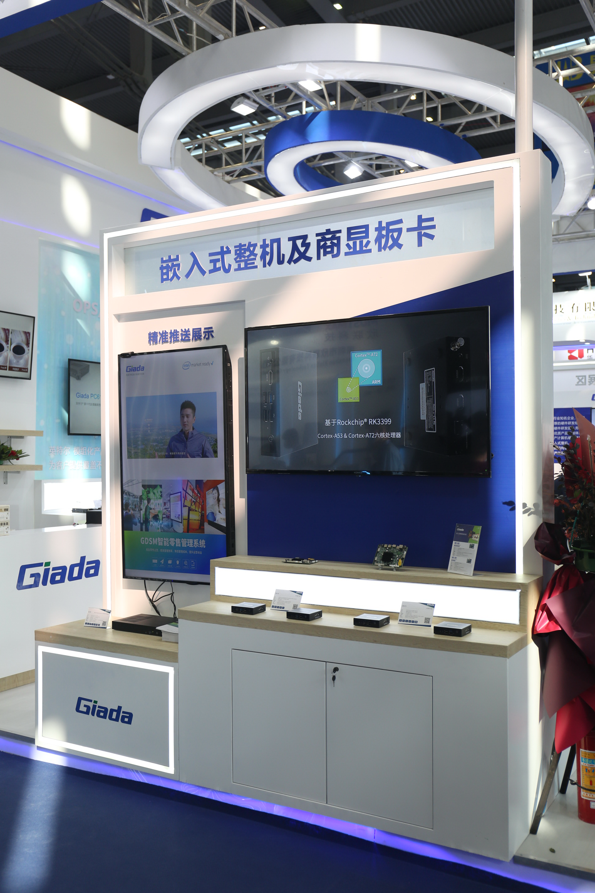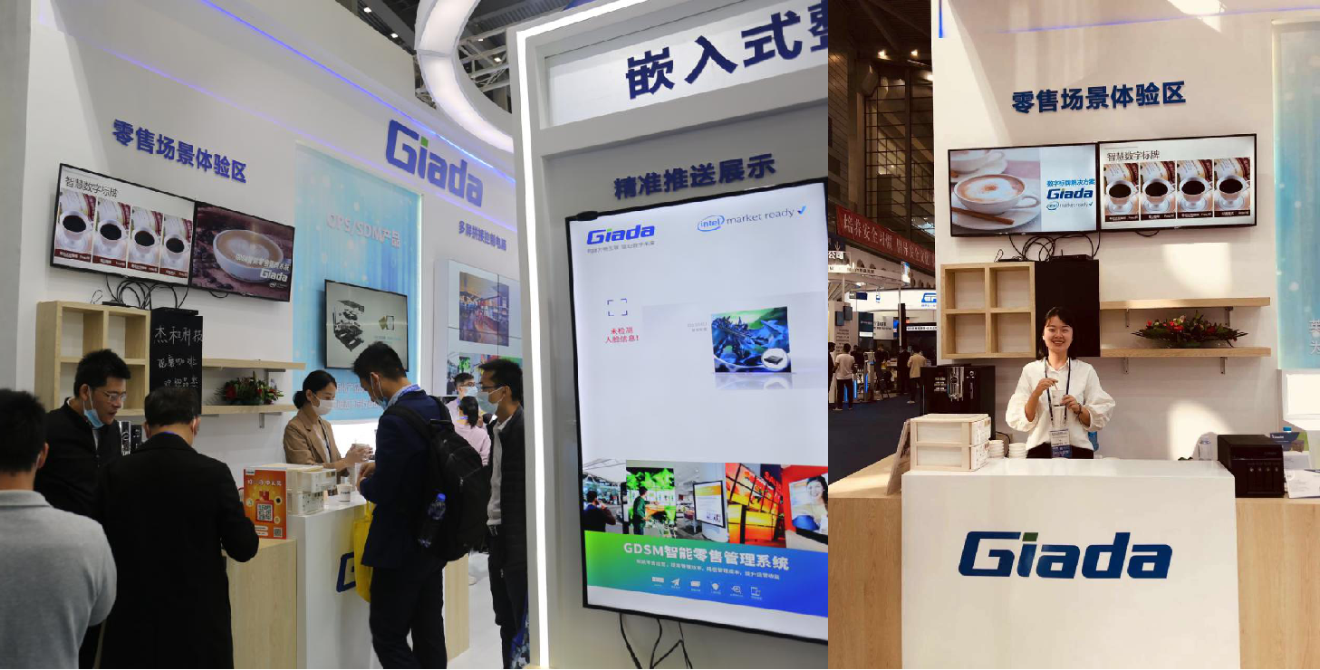 緊鄰ARM架構商顯產品集的精準推送展示區與零售門店模擬展區,共同組成了本屆展會杰和科技展位的一大精彩設計。場景展現了GDSM智能零售管理系統在零售門店場景下的展示效果,頂部的數字標牌由GDSM系統推送內容,模擬搭建了針對人流動線的廣告精準推送形態。