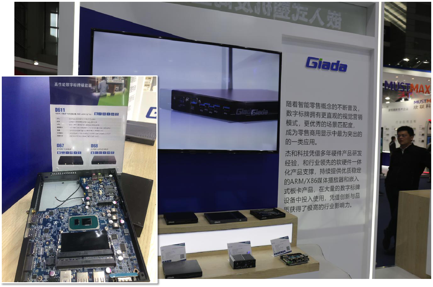 步入杰和科技展位,首先呈現的是杰和科技近年的商用顯示ARM產品集和GDSM廣告精準推送演示。杰和科技DN系列媒體播放器分別使用了瑞芯微RK3288、RK3328和RK3399三款核心芯片;全部采用116mm*107mm*30mm的緊湊外觀設計,輕便靈活;搭載RK3399的DN74媒體播放盒具備雙屏4K異顯輸出能力,DN75在DN74的基礎上額外擴展了HDMI-in視頻輸入接口,支持畫中畫或投屏顯示。杰和科技現場布署的所有單個屏幕都由DN系列媒體播放器作為信號源,GDSM智能零售管理系統下發的廣告信息通過后臺推送,再現了零售場景下如何管理多個分散布署的廣告屏。