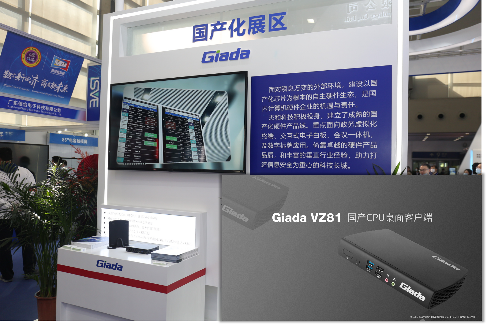 展位的對側是本屆展會的另一大重點產品展區,聚焦國產化核心產品線。本次亮相的VZ81國產計算機經過了考究的工業外觀設計,搭載16nm制程飛騰FT2000處理器,支持VGA、HDMI雙視頻接口拓展異顯輸出,雙網卡雙網口通訊。適用于政務、教育、公共服務及”8+2”應用場景。在國際形式緊張的大環境下,擁有自主獨立的計算機硬件設計生產技術儲備,是每個國內計算機硬件廠商的責任和擔當。