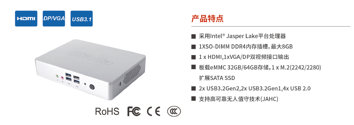 VT26采用JasperLake平臺,搭載N5095處理器,使用IntelUHD Graphics,提供一組HDMI數字顯示接口,支持4K超高清內容顯示,一組VGA模擬顯示接口,最大1080P單屏播放能力,提供高清流暢的桌面體驗,為用戶體驗帶來質的提升。