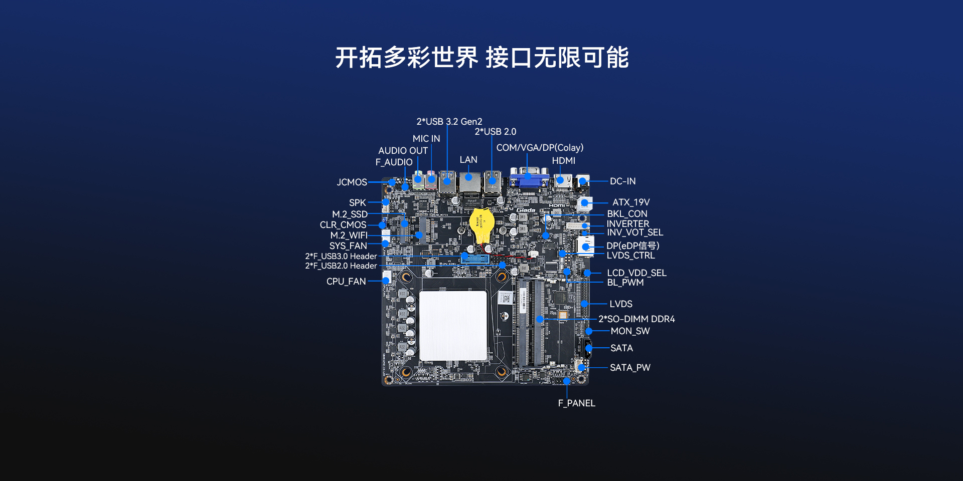 | 內部I/O | 接口 | 1 x M.2(2280) for(pcie4.0x4/sata3.0) SSD 1 x M.2(2230) for WIFI/BT 2 x USB2.0 9pin, 2 x USB3.0 20pin 1 x LVDS 30pin, 1 x INVENTER 8pin 1 x INV_VOT_SEL 4pin,1 x LVDS_CTRL 3pin 1 x BKL-CON 4pin 1 x COM 9pin 1 x SATA for HDD/SSD, 1 x HDD_PWR 4pin 1 x MON_SW 5pin, 一鍵靜音/一鍵熄屏/音量加減 1 x SYS_FAN 4pin |